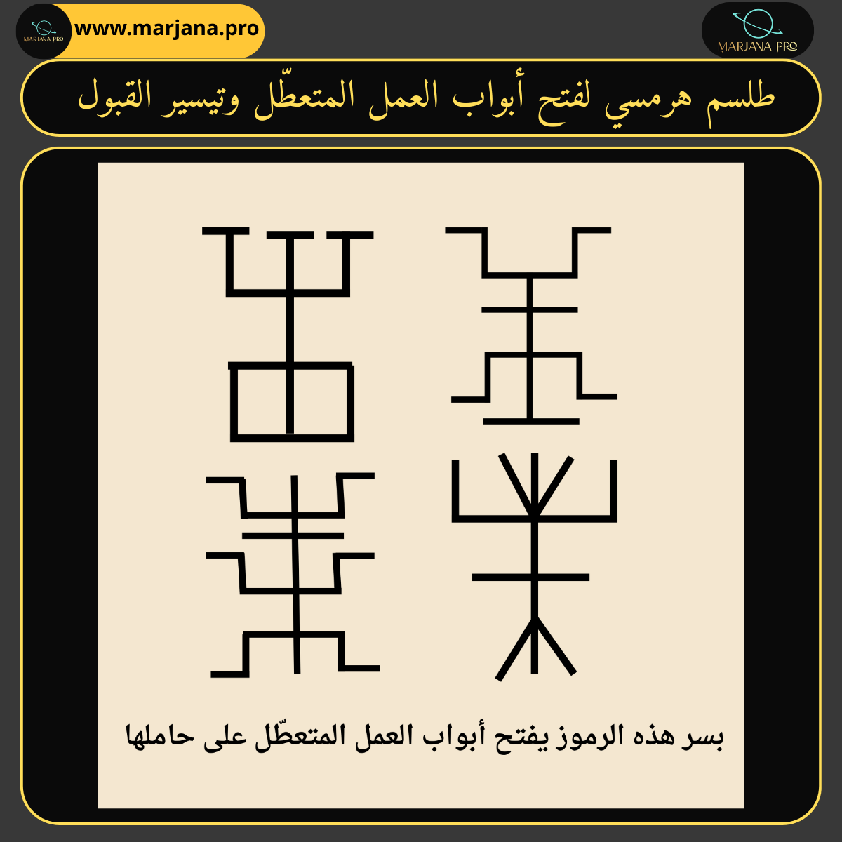 الطلسم الروحاني هو تركيب رمزي يُستعمل ضمن إطار تعليمي، يقوم على توجيه القصد وتنظيم المعنى، ويُنظر إليه كوسيلة مساعدة لإعادة التوازن لمسار معيّن من مسارات الحياة. وهذا الطلسم مخصّص تحديدًا لمن يعاني من توقّف أو تعثّر في مجال العمل، أو من ضعف القبول رغم المحاولات الجادة.