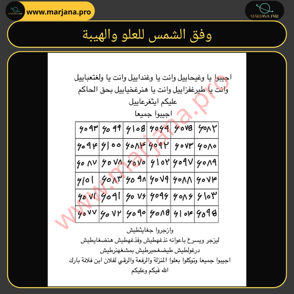 يُعد وفق الشمس للعلو والهيبة من أشهر الأوفاق الروحانية الهندسية في علم الأوفاق، ويُستخدم لطلب القبول وعلو المنزلة والهيبة الاجتماعية وفق منهج حسابي منضبط.